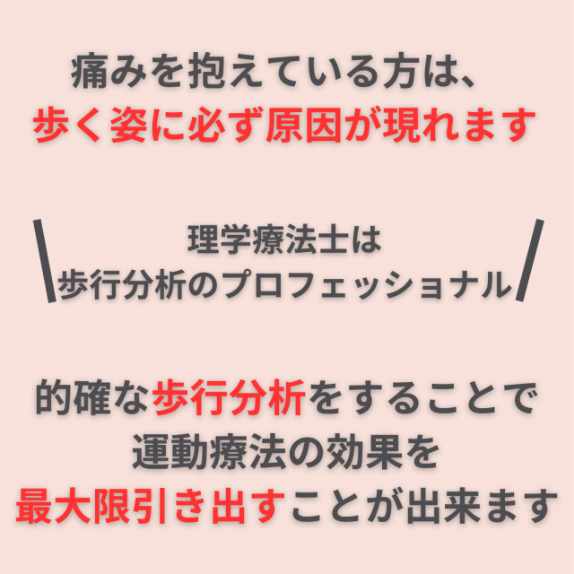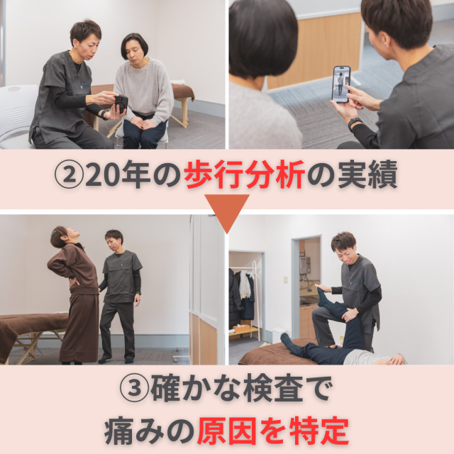 生活習慣など痛みの原因になる要素をヒアリングした上で、姿勢や歩行、身体の状態をみて、痛みの原因が何かを見つけ出します。