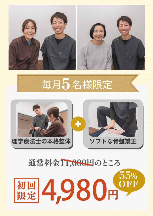 そこで当院では、しっかりとヒアリングし、痛みの原因をしっかりと把握した上で、オリジナルの施術を行い、早期の症状回復を目指します!