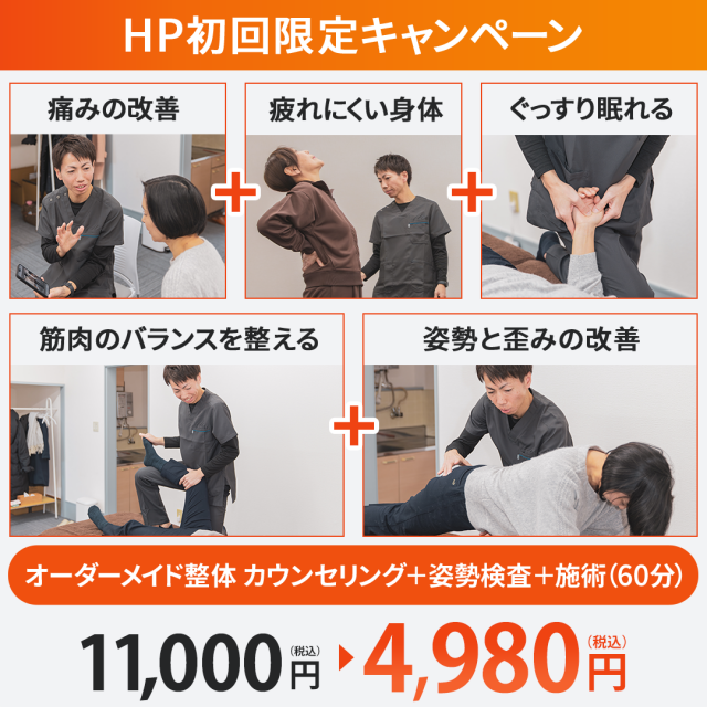 そのため、当院ではお客様の「歩き方や座り方・重心のかけ方」を確認し、姿勢を整えるための背骨・骨格矯正と姿勢指導も行います。